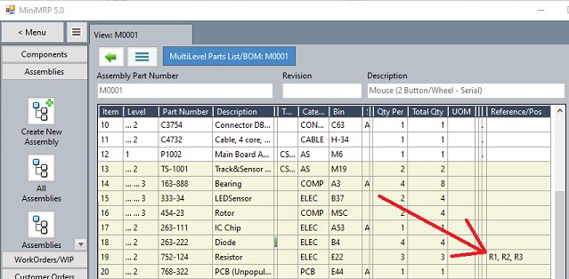 | By: Guest | Posted on: Nov 10 2025 at 09:01:05 AM | If you're looking at an assembly's parts list or a Work Order BOM you should see the Ref/Pos field. It looks like this