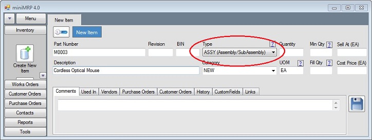 Enter the part number and description and ensure the 'Type' is "Assembly/SubAssembly" - see the image above.