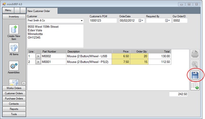 Click the save button to save the order.