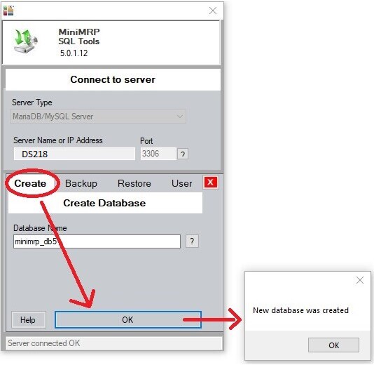To create a new/empty database on your server select the 'Create' tab and click OK. Assuming you have the necessary permission to create database you should, after a few seconds, get a notification saying the new database was created.