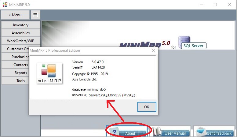 At the very top of the setup window select the option "Connect to MySQL or MSSQL Server" Next is 'Server Type'. Change the 'Server Type' to 'Microsoft SQL Server'. If MiniMRP and your SQL Server are both running on the same machine (or where your Windows users all login to Windows against a domain controller) you should be able to select the server name from the drop down 'Server Name' list and select the 'Windows Authentication' method allowing you to skip the login details username/password. In our example though we're making it a little more complicated by connecting to a remote machine running the free 'express' edition of SQL Server named named "SQLEXPRESS". Other 'non-express' versions of SQL Server often accept just the name of the machine where SQL Server is running but when connecting to remote instances of SQL Express or other named instances you usually need to give the machine name, the name of the sql server instance and the port number separated by \slash and ,comma in the format "MACHINE-NAME\SERVER-NAME,PORT-NUMBER" as shown in the image above. Click the 'Test and Save' button. If you've set everything up correctly you'll see the 'Success' message. If you see an error message instead then check your settings and try again. If necessary go back to Server Setup If setup correctly you can restart MiniMRP. Click the "About" button to confirm you've connected to your SQL server