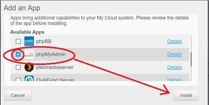 Login to your WD Nas desktop. Select "Apps" from the options across the top of the window. This brings up a window showing all packages installed on your NAS. Look to see if phpMyAdmin is in the list.