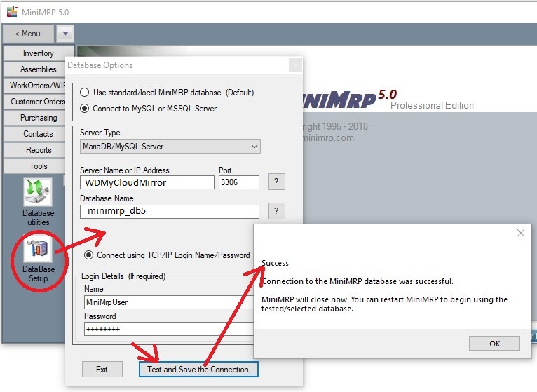 Setting up the MiniMRP program to connect to MariaDB or MySQL.