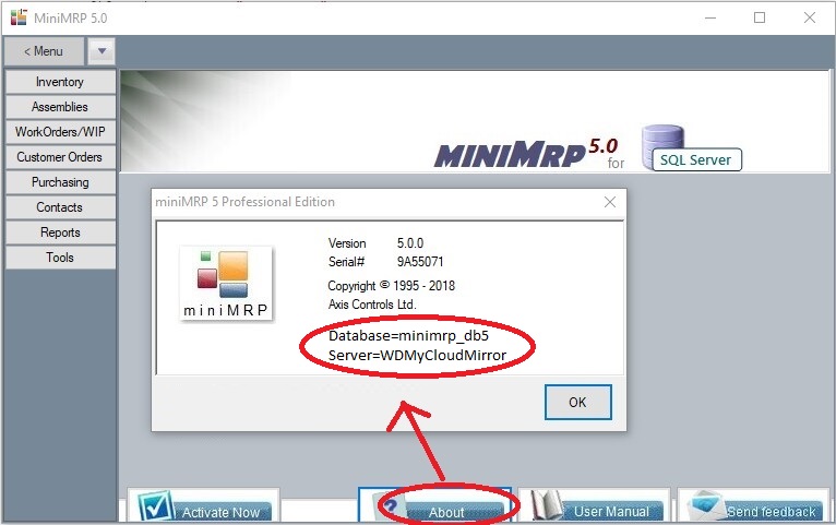 Once setup correctly MiniMRP will close and you can restart MiniMRP with the new connection settings. Click the "About" button to confirm you've connected to your NAS device.