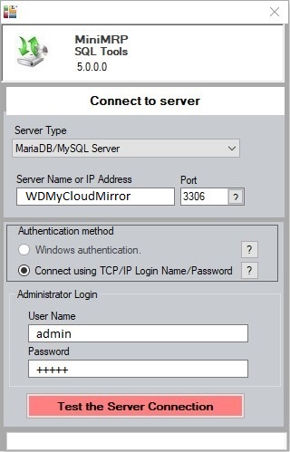 Select: Server Type "MariaDB/MySQL Server" and other options as shown above. In our example we're testing with a WD MyCloud device and we're able to connect using the device's name 'WDMyCloudMirror' and the default port number '3306'. Depending on your device and network setup you may need to enter the IP address or a different port number for the NAS device instead.