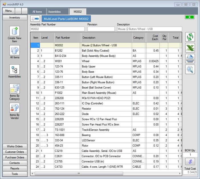 We've done that to show you that miniMRP can handle prices down to 5 decimal places. At the bottom right corner of the window you see the total cost to build ONE finished assembly.